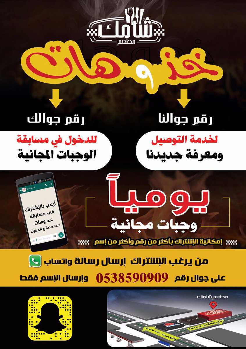 رقم مطعم برغرايزر حائل حي النقرة طريق فهد العريفي بجوار متجر النصر يقدم البرجر و عدة اصناف لذيذة و مميزة رقم توصيل طلبات برغرايزر الموحد 920022997. مطعم الشام شامك Al Sham Shamek Restaurant من مطاعم القصيم الخاصة بالمأكولات الشامية كالمشويات والمقبلات وطواجن و أرز وسلطات وكباب لا يوجد مكان للعوائل. رقم توصيل مطعم التراثي حائل فرع النقرة مطعم شعبي افطار غداء عشاء يقدم الأكلات الشعبية والمشرويات والسلطات.