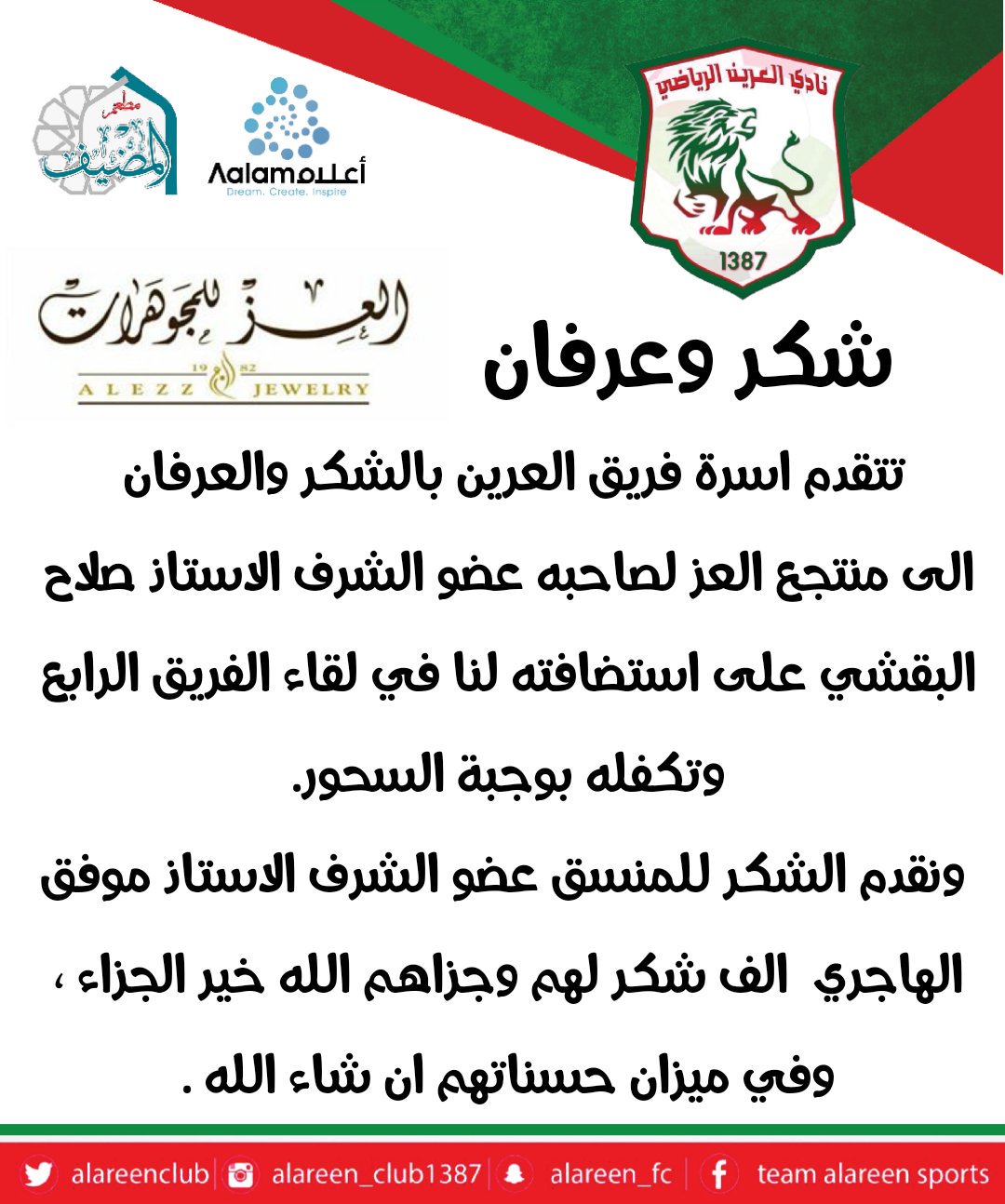 Alareen Club בטוויטר الشريك الأستراتيجي للفريق مطعم المضيف شركة أعلام 0135822881 حي الفيصليه ـ شارع النجاح